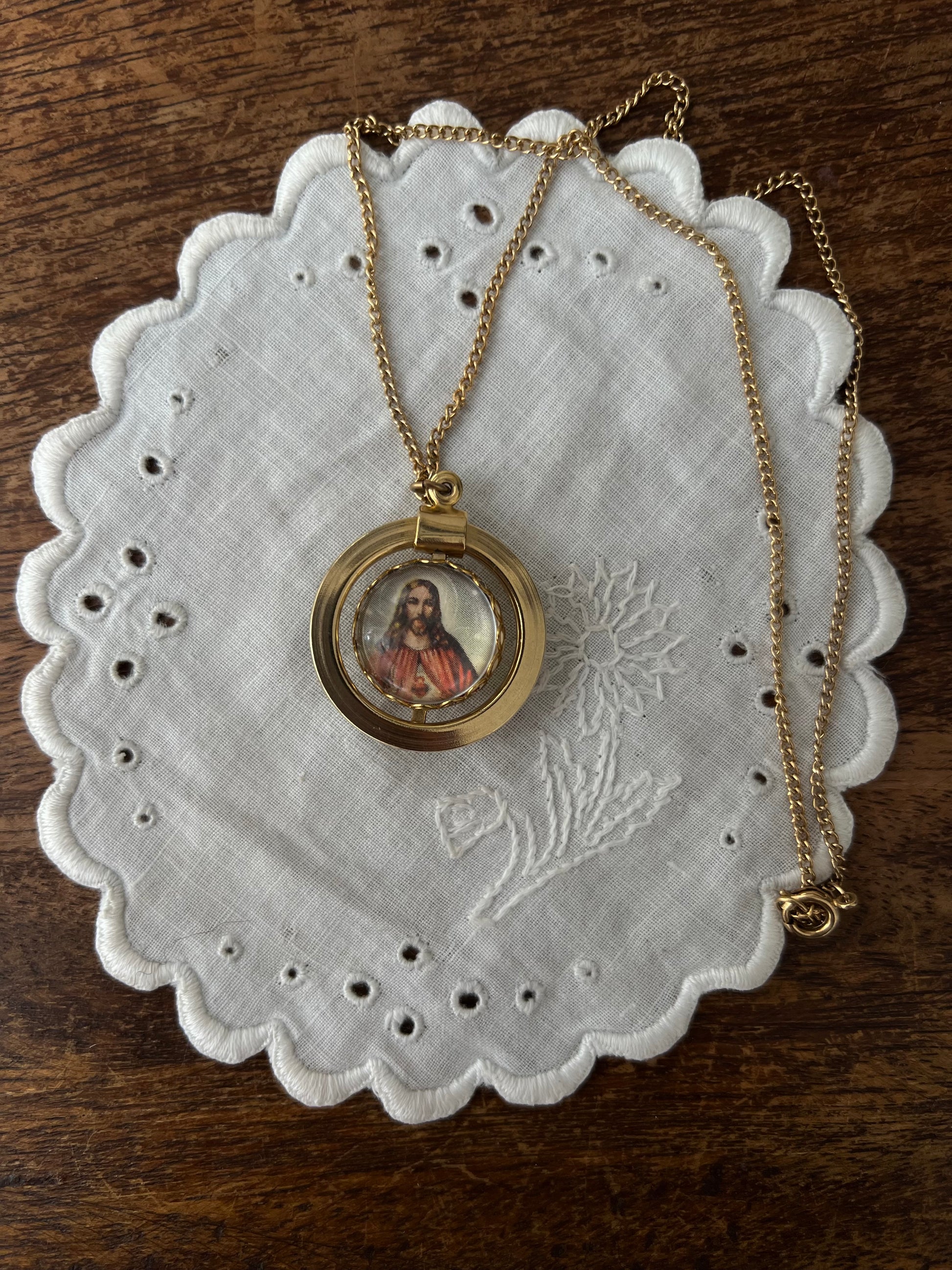 Stainless steel chain and a vintage pendant with a rotating center that reveals two sacred images.